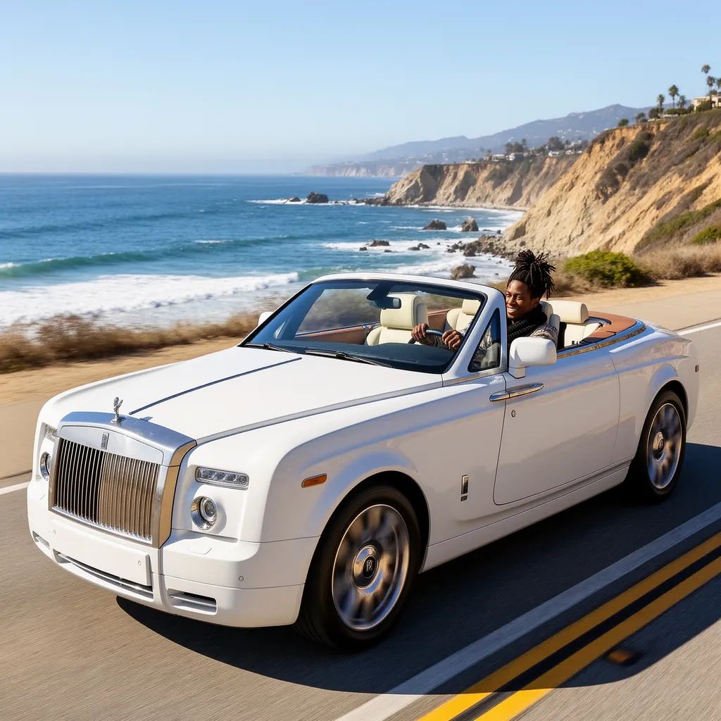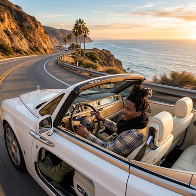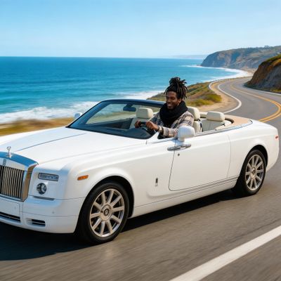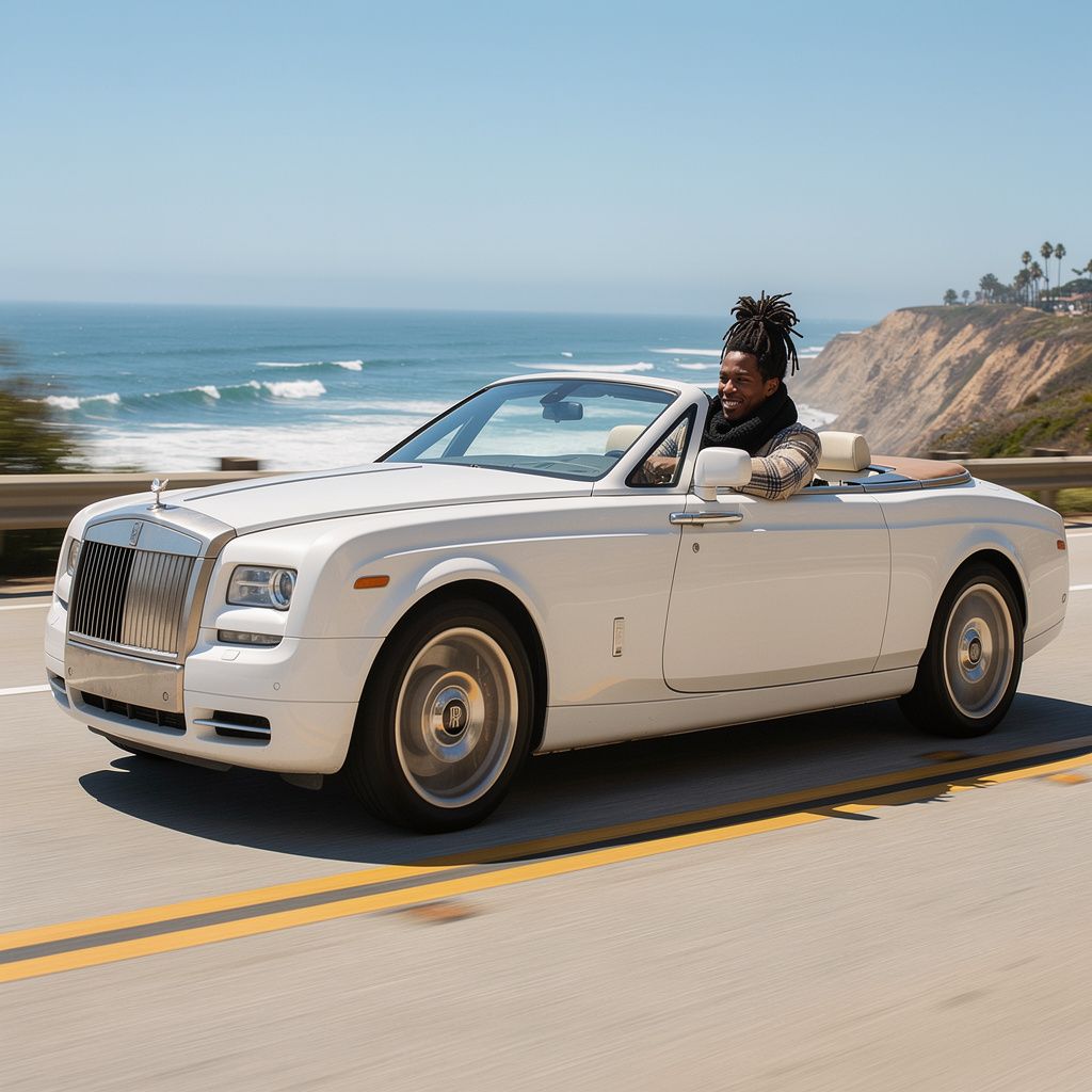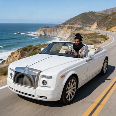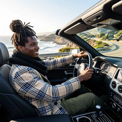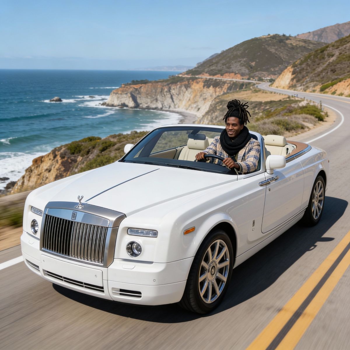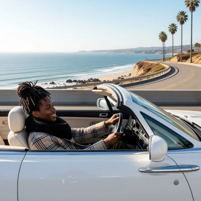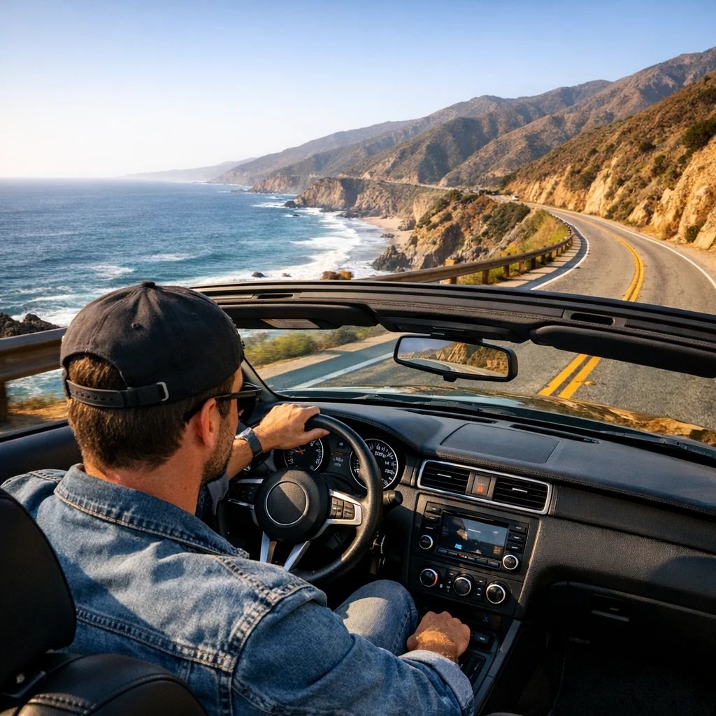 “Make a photo of the man driving the car down the California coastline”