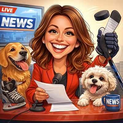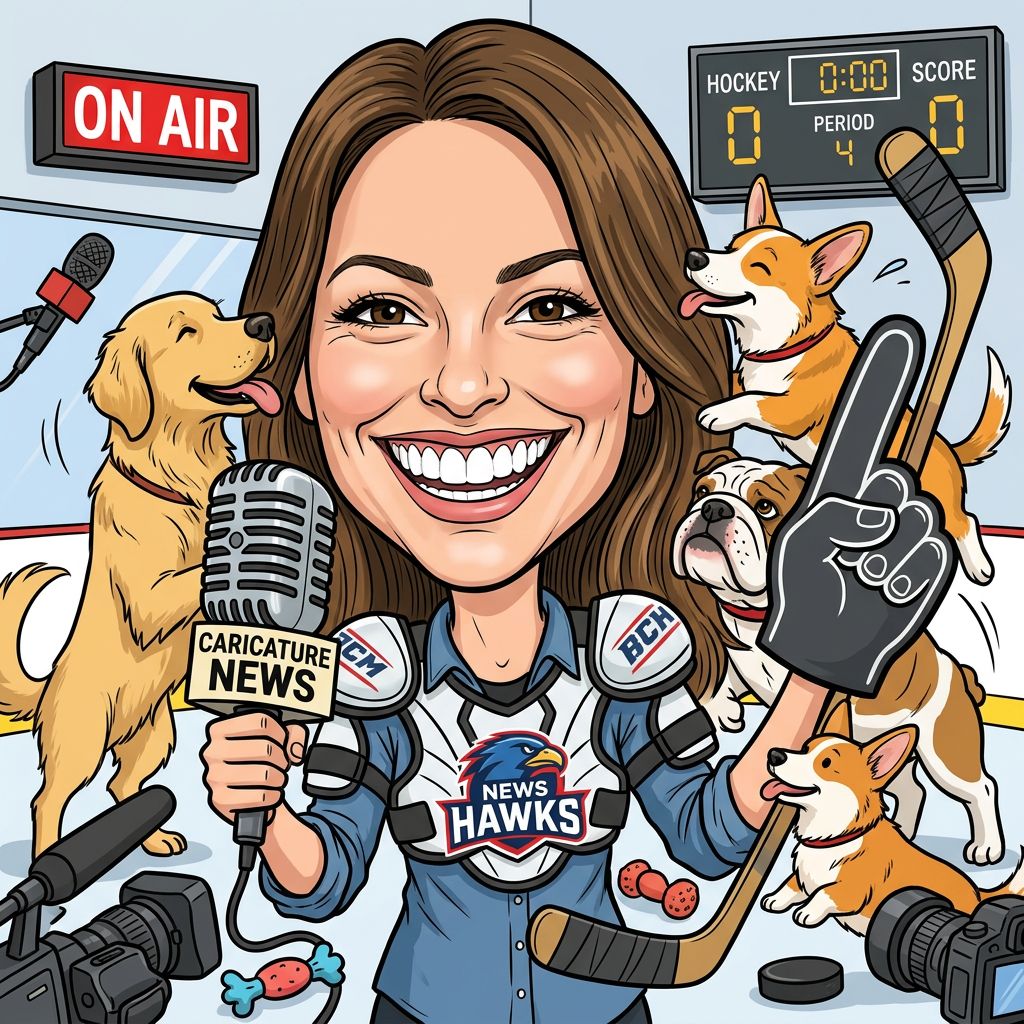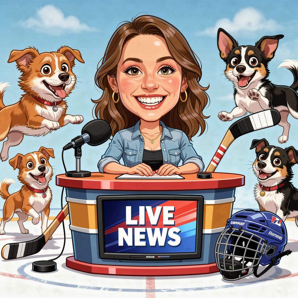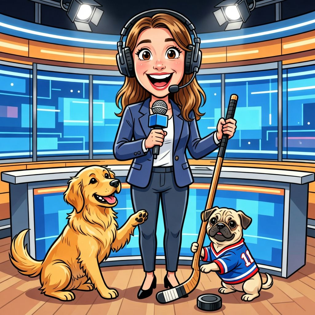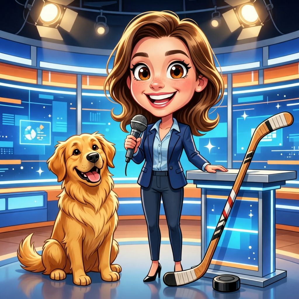 “Create a caricature of me and my job. Make it exaggerated and humorous, incorporating my profession as a tv show anchor and my love for dogs and hockey.”