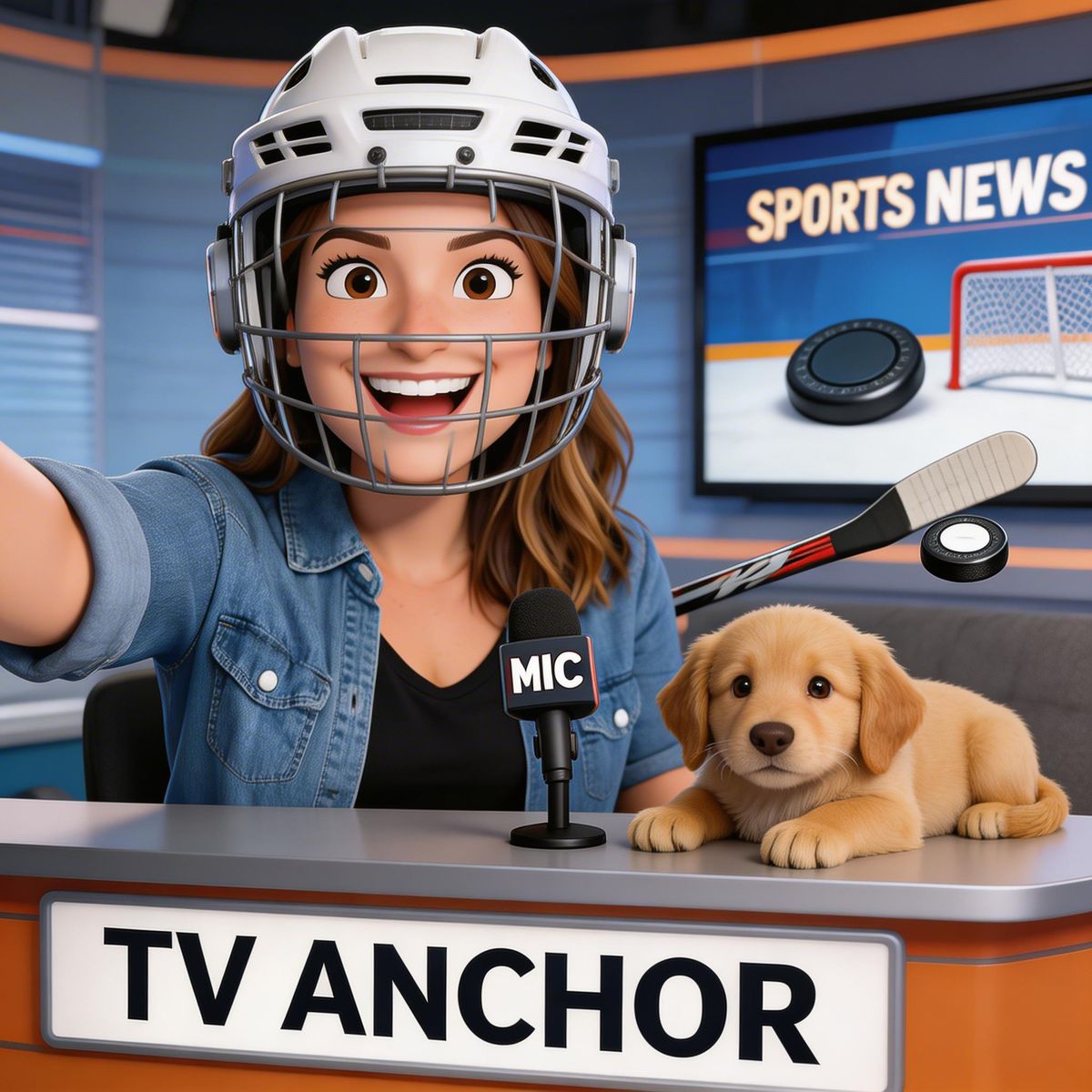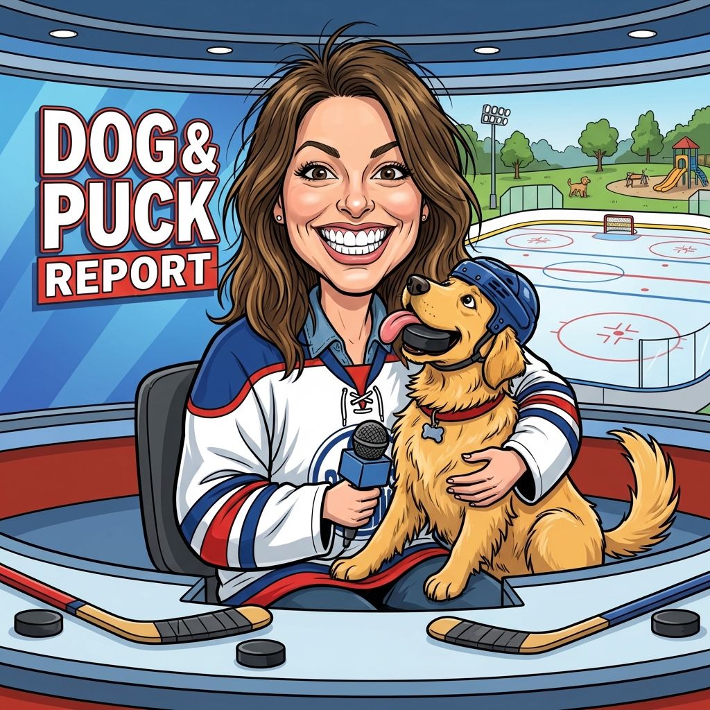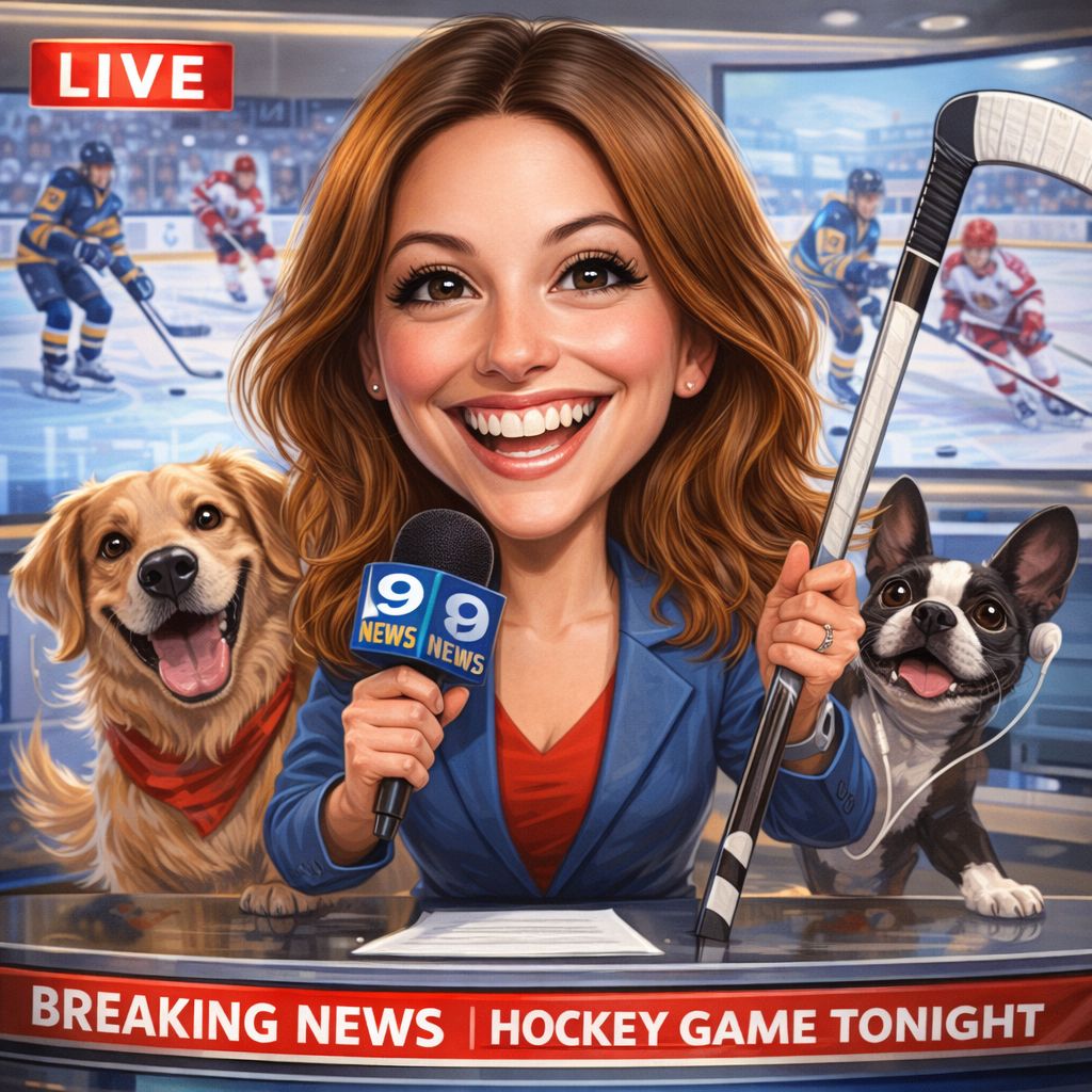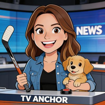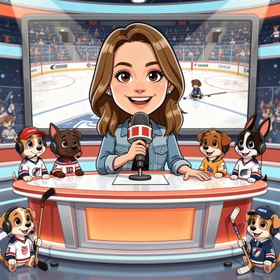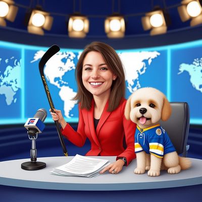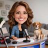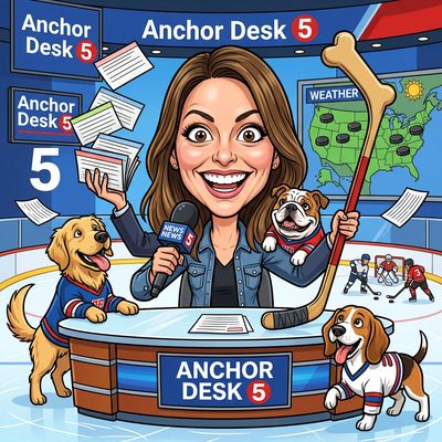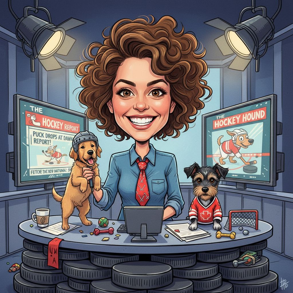 “Create a caricature of me and my job. Make it exaggerated and humorous, incorporating my profession as a tv show anchor and my love for dogs and hockey.”