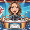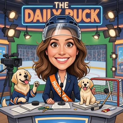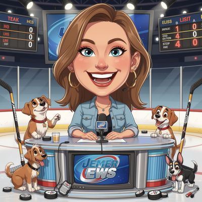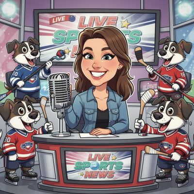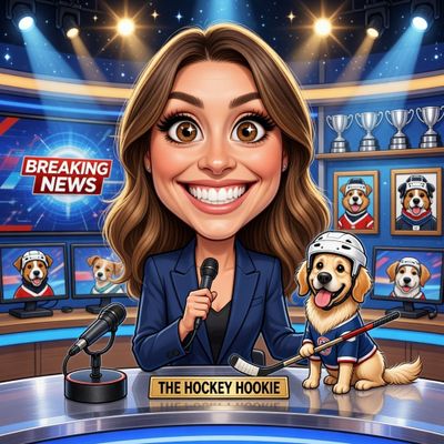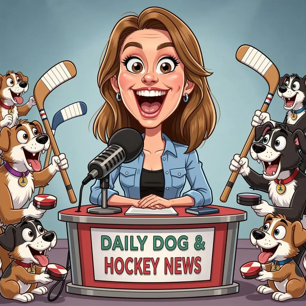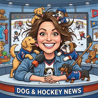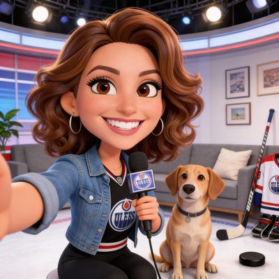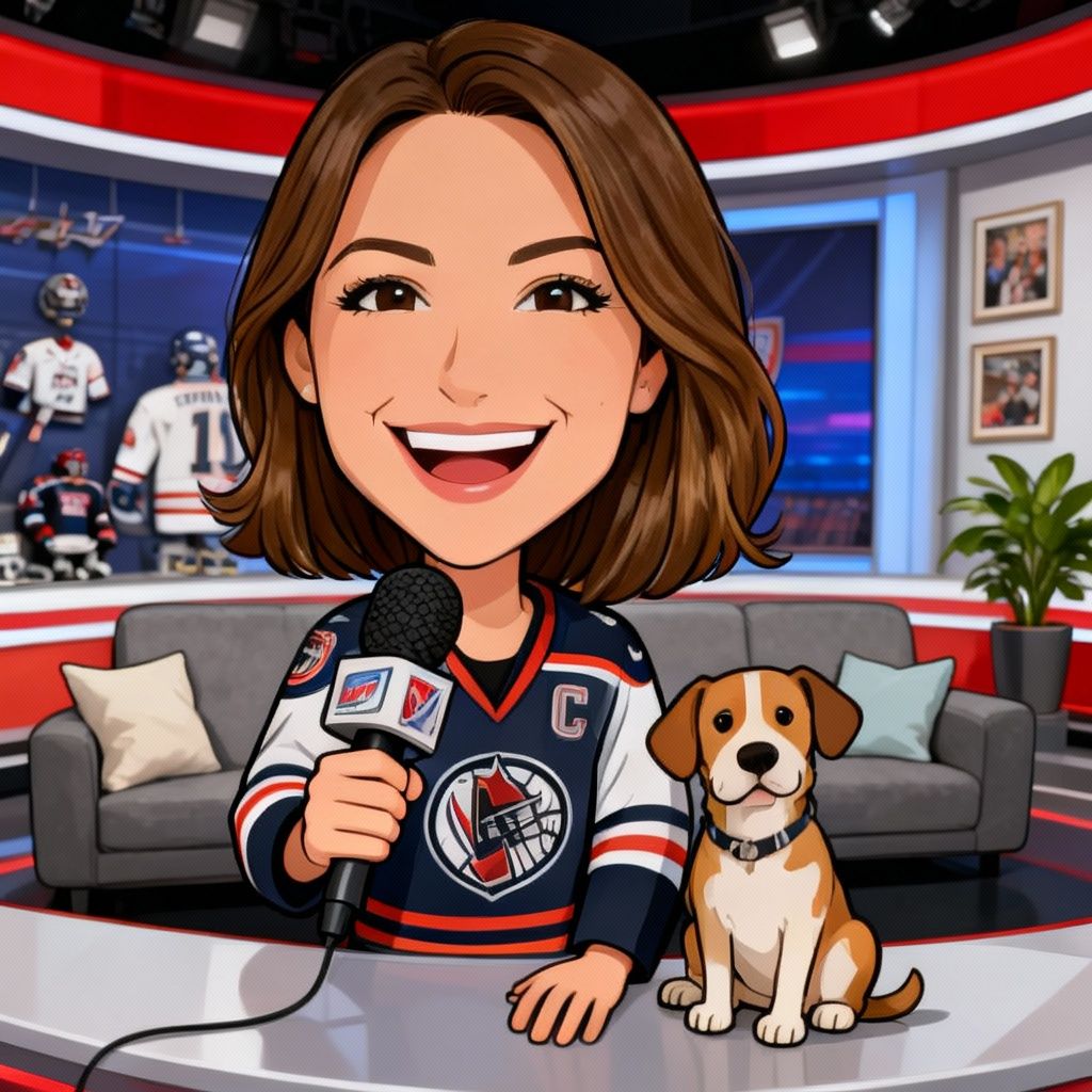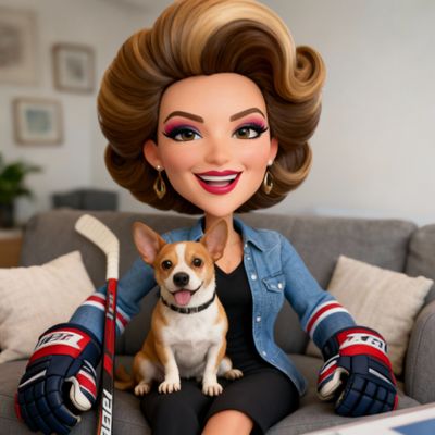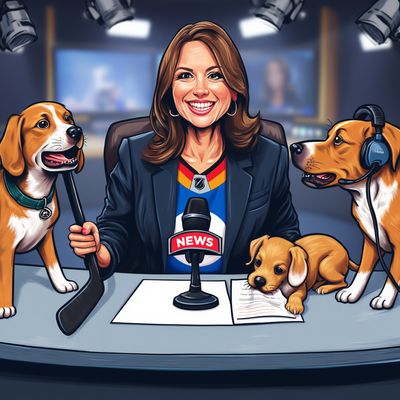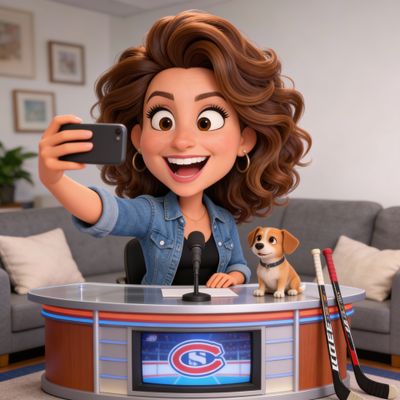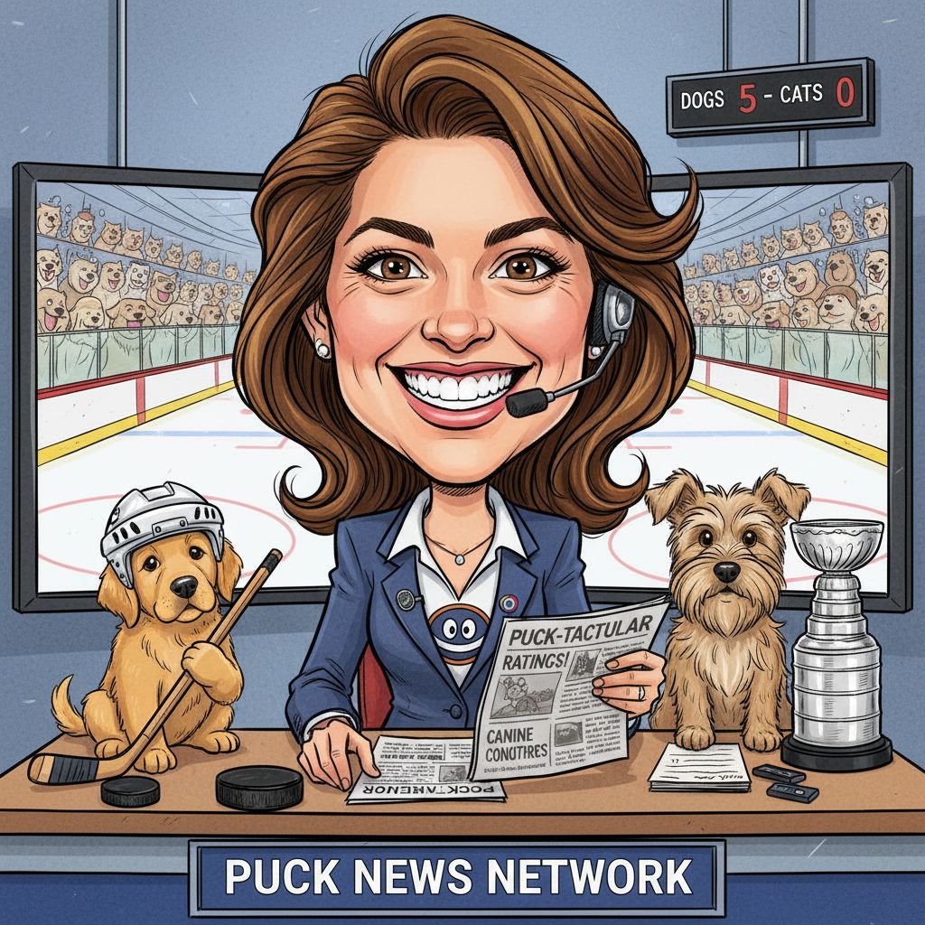 “Create a caricature of me and my job. Make it exaggerated and humorous, incorporating my profession as a tv show anchor and my love for dogs and hockey.”