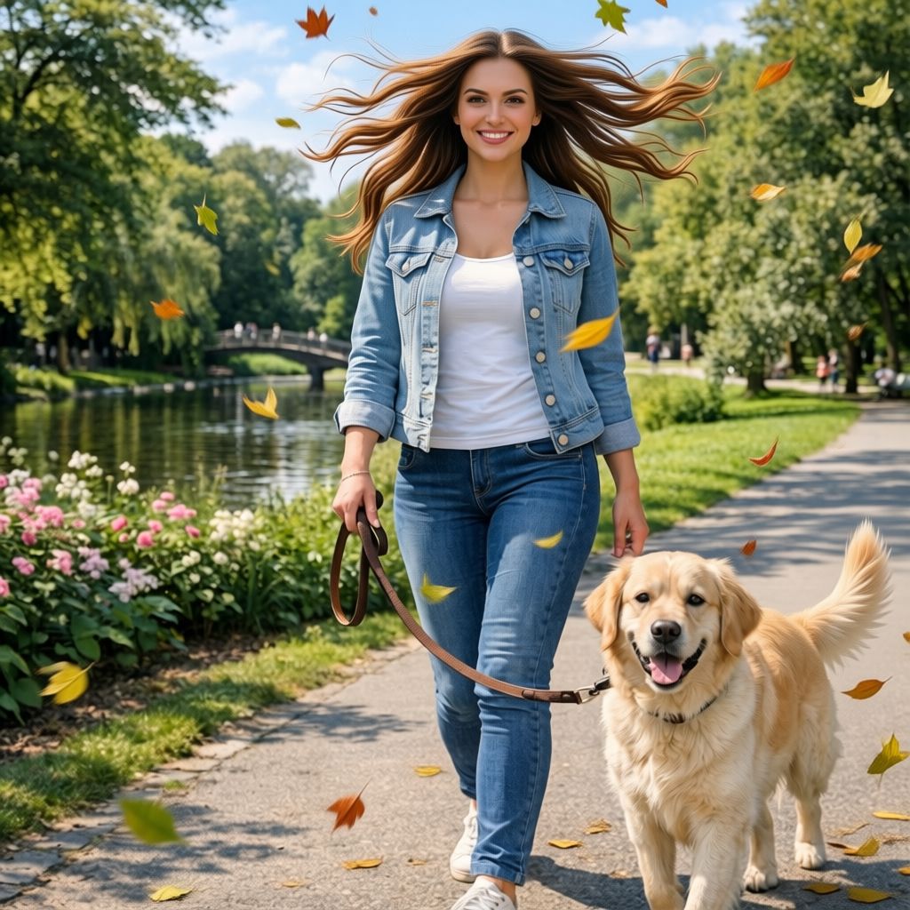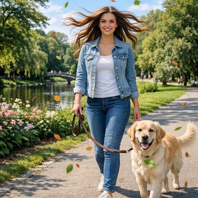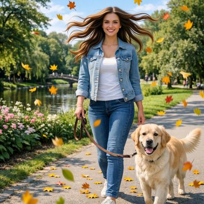 “Add dynamic motion to this photo: make hair blow in the wind, add leaves flying, energetic and lively feel.”