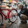“A candid street photo of an elderly Japanese man repairing a red bicycle in light rain, reflections on wet pavement, shallow depth of field, 50mm lens, natural skin texture, imperfect framing, motion blur from passing cars, cinematic but realistic, no stylization.”