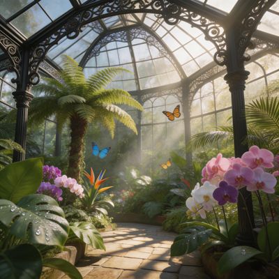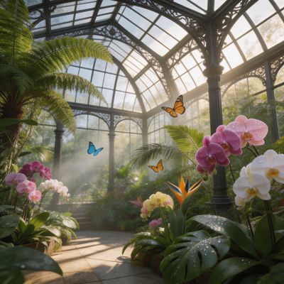 “Hyper-photorealistic interior of a lush Victorian glass greenhouse filled with exotic tropical plants, vibrant blooming orchids, tall ferns, colorful butterflies in flight, sunlight filtering through ornate glass roof creating realistic caustics and dew on leaves, intricate iron framework visible, misty atmosphere, 8K masterpiece.”