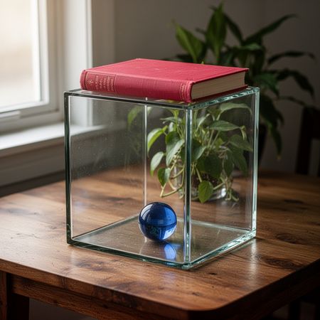 Text-to-Image“A glass cube on a wooden table. Inside the cube is a small blue sphere. On top of the cube sits a red book. A green plant is behind the cube, partially visible through the glass. Soft window light from the left.”