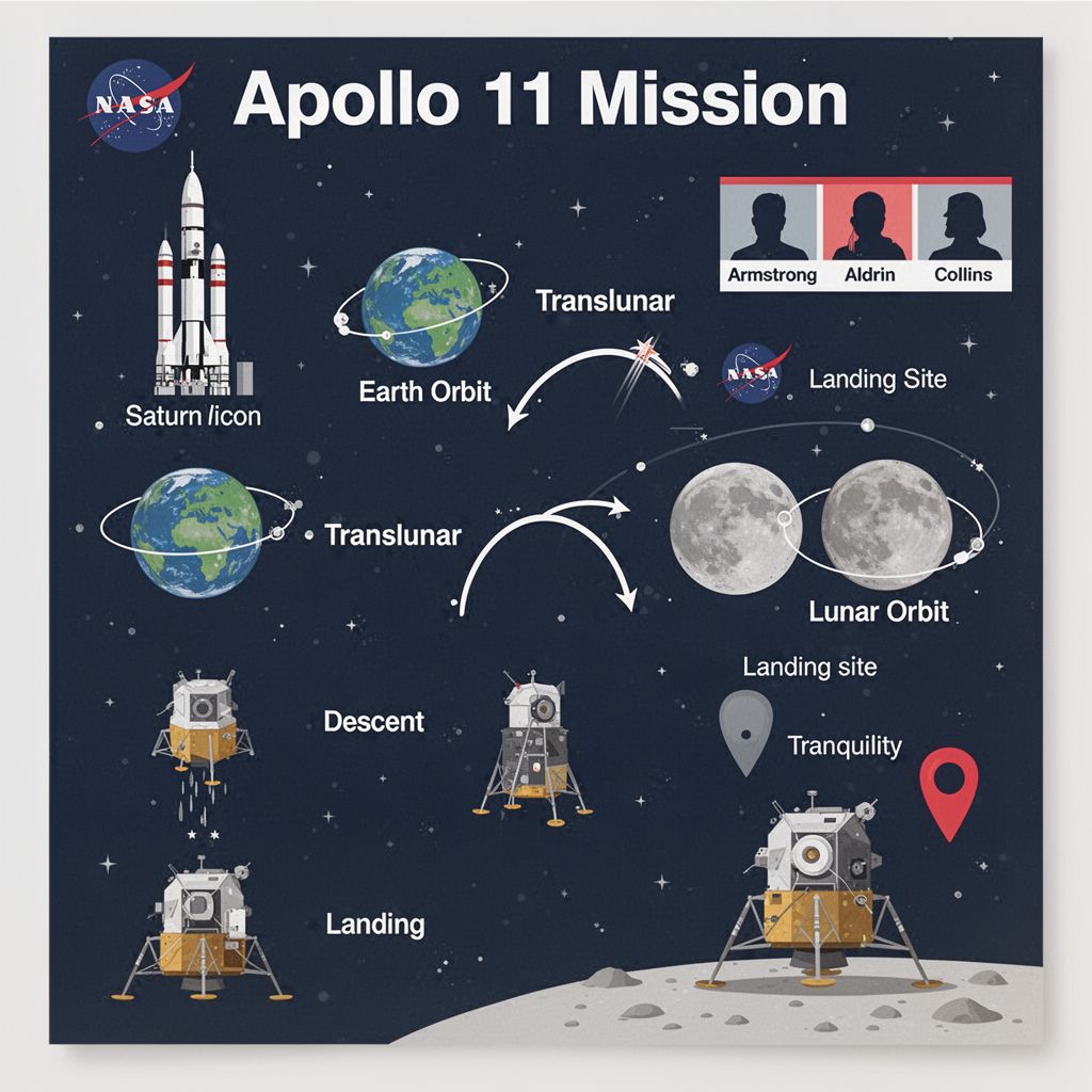 Text-to-Image“Create a clean, modern vector infographic poster about the Apollo 11 mission. NASA-inspired palette (navy, white, muted red, light gray). Flat-vector style, crisp lines, consistent iconography, subtle gradients only. Steps (stop at landing): 1. Launch (Saturn Vicon) 2. Earth Orbit (Earth + orbit ring icon) 3. Translunar (trajectory arc icon) 4. Lunar Orbit (Moon + orbit ring icon) 5. Descent (lunar module descending icon) 6. Landing (lunar module on the surface icon) Small supporting elements (minimal text): • Crew strip: three silhouette icons with only last names: Armstrong, Aldrin, Collins. • Landing site marker: Moon pin labeled "Tranquility" only. Layout constraints: generous margins, large readable labels, clean background with subtle stars. Vector-only, print-poster look, high resolution.”