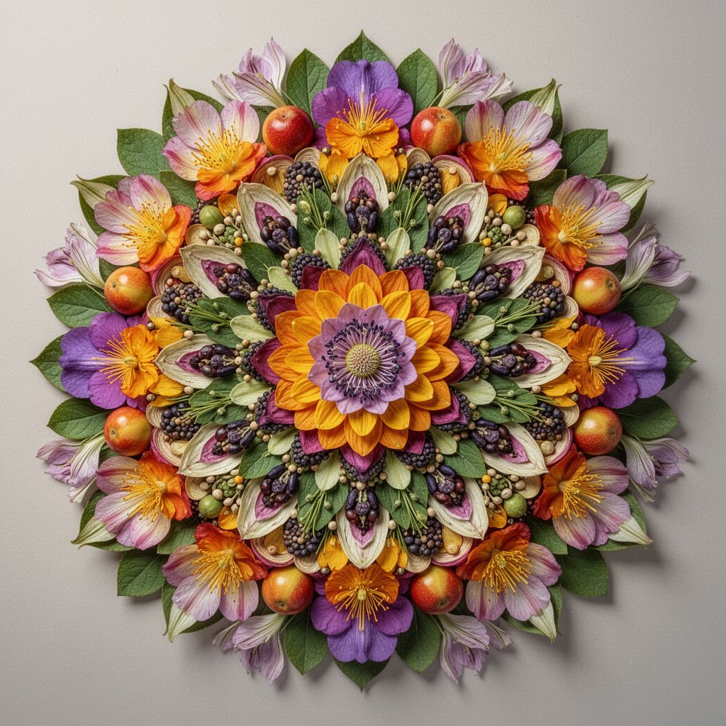 Text-to-Image“Perfectly symmetrical mandala made entirely of real flowers, petals, leaves, fruits, and seeds in vibrant natural colors, intricate layered patterns with radial symmetry, top-down view on a soft neutral background, hyper-detailed organic textures and subtle shadows, photorealistic, 8K masterpiece.”