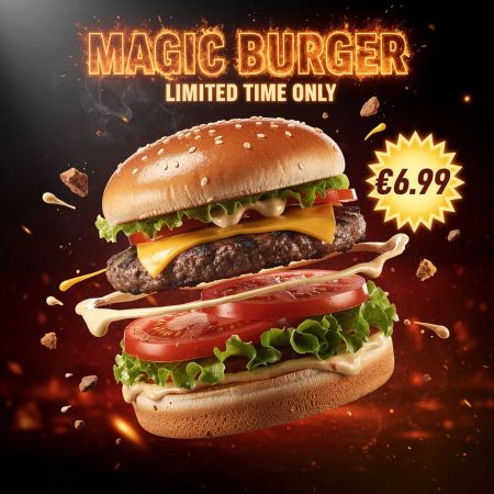 Text-to-Image“Ad for 'Magic Burger'. Dynamic, exploded burger with all components (bun, patty, cheese, lettuce, tomato, sauce) suspended in mid-air. Emphasize photorealistic detail and a sense of motion. Dark, fiery background with glowing embers. Integrate text: 'MAGIC BURGER' as a prominent title, 'LIMITED TIME ONLY' as a secondary message, and '€6.99' in a starburst, all rendered with a fiery, glowing effect.”