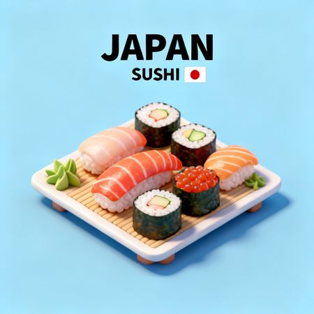 Text-to-Image“Create a clear, 45° top-down isometric miniature 3D cartoon scene of Japan's signature dish: sushi, with soft refined textures, realistic PBR materials, gentle lighting, on a small raised diorama base with minimal garnish and plate. Solid light blue background. At top-center: 'JAPAN' in large bold text, 'SUSHI' below it, small flag icon. Perfectly centered, ultra-clean, high-clarity, square format.”
