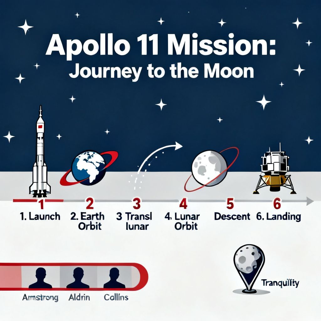 Text-to-Image“Create a clean, modern vector infographic poster about the Apollo 11 mission. NASA-inspired palette (navy, white, muted red, light gray). Flat-vector style, crisp lines, consistent iconography, subtle gradients only. Steps (stop at landing): 1. Launch (Saturn Vicon) 2. Earth Orbit (Earth + orbit ring icon) 3. Translunar (trajectory arc icon) 4. Lunar Orbit (Moon + orbit ring icon) 5. Descent (lunar module descending icon) 6. Landing (lunar module on the surface icon) Small supporting elements (minimal text): • Crew strip: three silhouette icons with only last names: Armstrong, Aldrin, Collins. • Landing site marker: Moon pin labeled "Tranquility" only. Layout constraints: generous margins, large readable labels, clean background with subtle stars. Vector-only, print-poster look, high resolution.”
