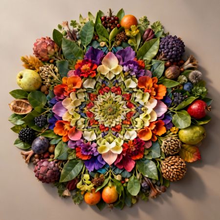 Text-to-Image“Perfectly symmetrical mandala made entirely of real flowers, petals, leaves, fruits, and seeds in vibrant natural colors, intricate layered patterns with radial symmetry, top-down view on a soft neutral background, hyper-detailed organic textures and subtle shadows, photorealistic, 8K masterpiece.”