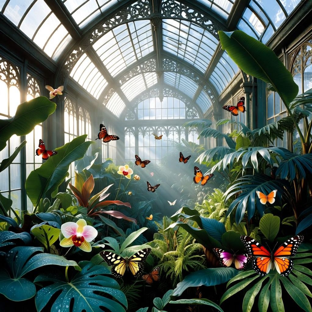 Text-to-Image“Hyper-photorealistic interior of a lush Victorian glass greenhouse filled with exotic tropical plants, vibrant blooming orchids, tall ferns, colorful butterflies in flight, sunlight filtering through ornate glass roof creating realistic caustics and dew on leaves, intricate iron framework visible, misty atmosphere, 8K masterpiece.”