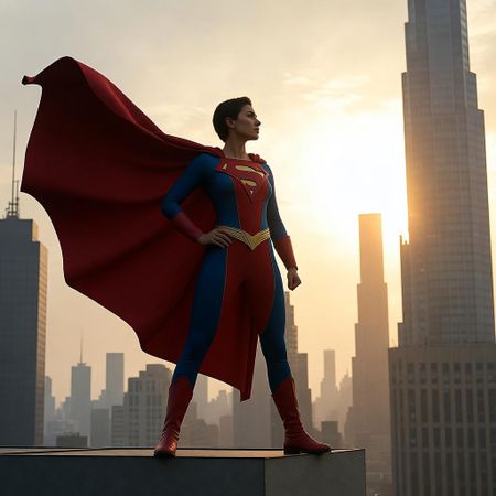 Text-to-Image“Hyper-photorealistic full-body portrait of a female superhero standing triumphantly on a New York skyscraper rooftop at golden sunset, wearing a classic modest superhero costume with flowing cape, chest emblem, gloves, and boots in red and blue colors, practical design, short hair, strong determined heroic expression looking into the distance, powerful confident stance with hands on hips and cape billowing dramatically in the wind, detailed urban cityscape background, warm natural sunlight with sharp shadows and fabric highlights, ultra-sharp textures on suit, hair, and concrete, 8K masterpiece, empowering family-friendly style.”