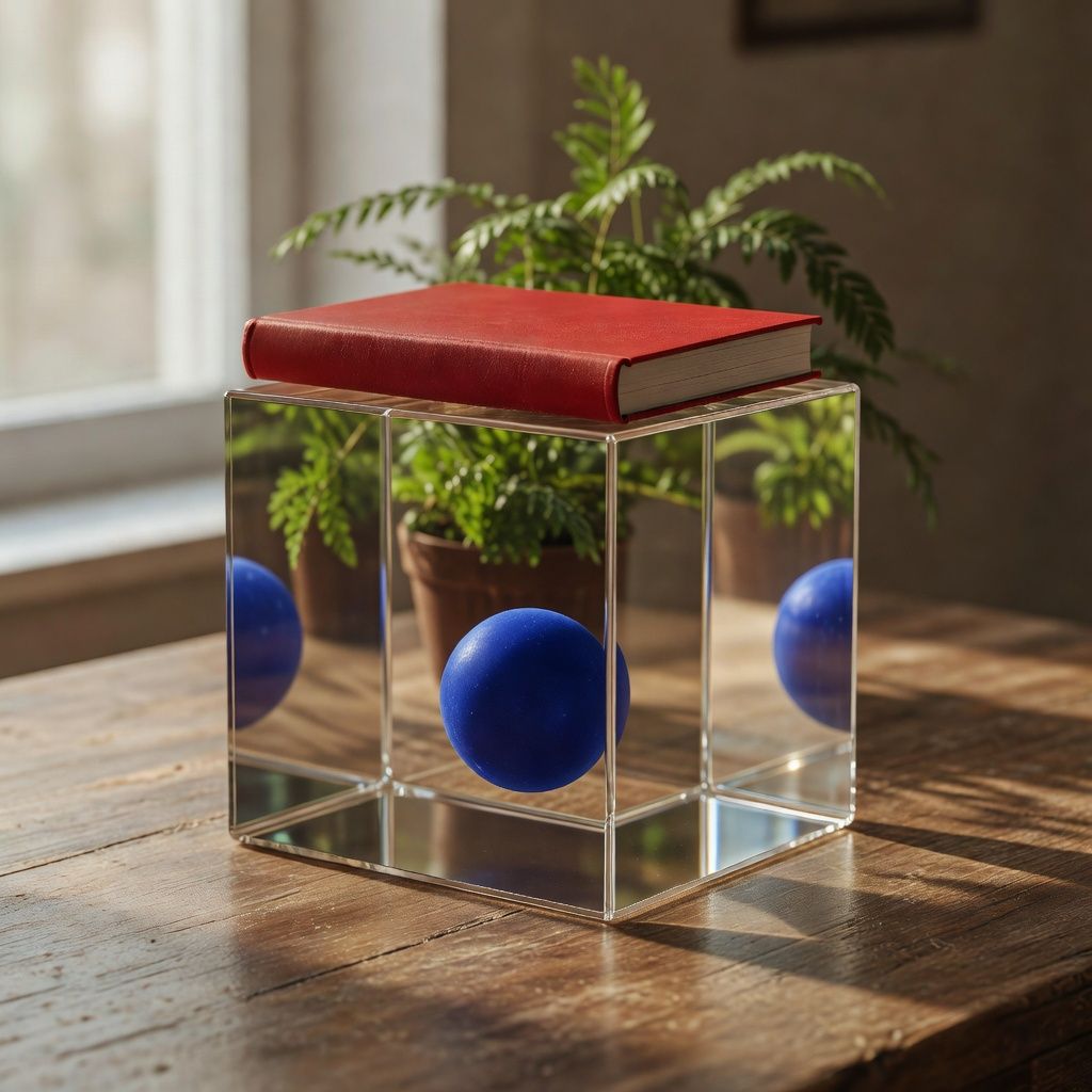 Text-to-Image“A glass cube on a wooden table. Inside the cube is a small blue sphere. On top of the cube sits a red book. A green plant is behind the cube, partially visible through the glass. Soft window light from the left.”
