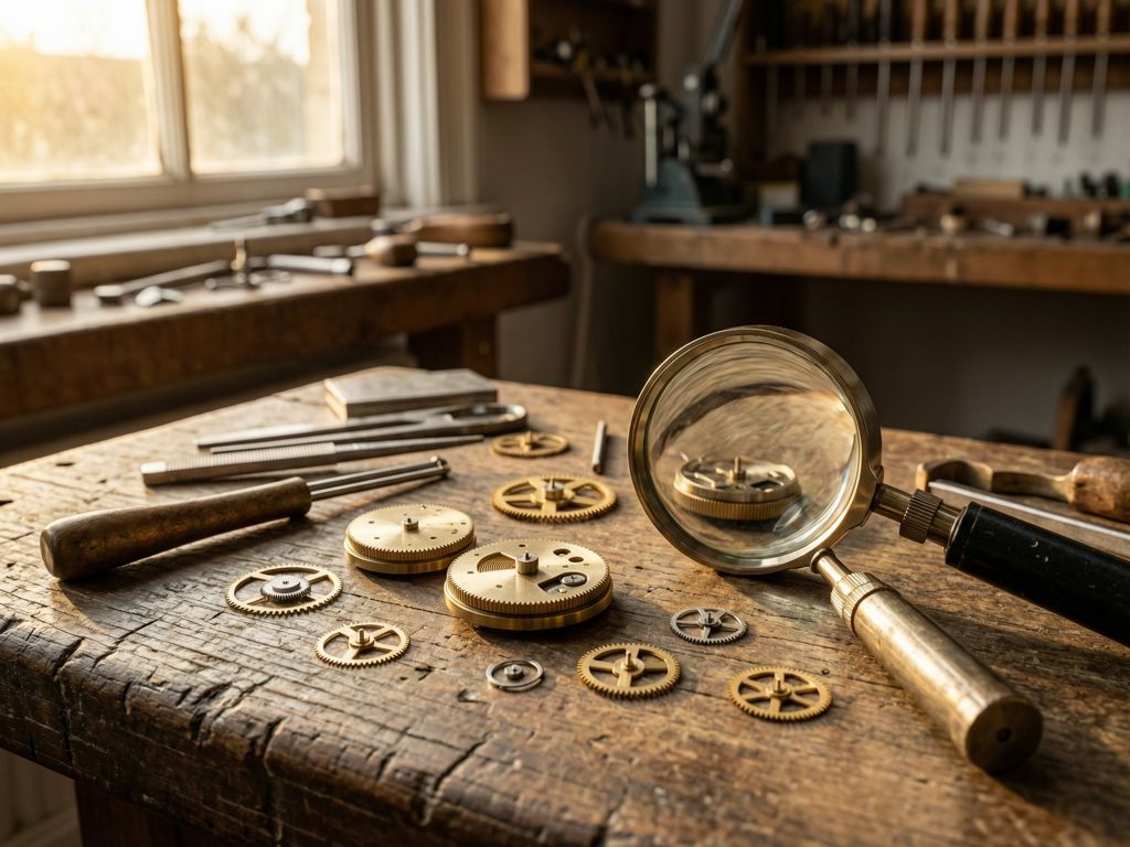 A hyper-realistic close-up of a weathered, wooden artisan’s workbench scatter...