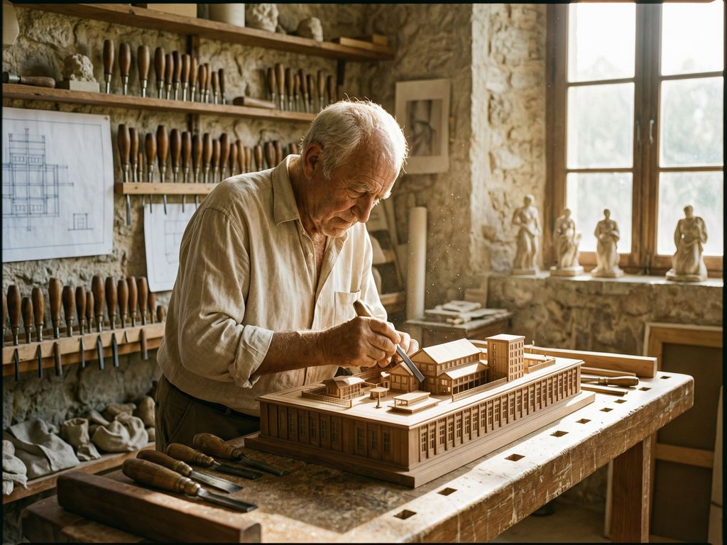 A medium shot of an elderly artisan in a sun-drenched Mediterranean workshop,...