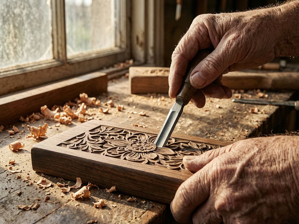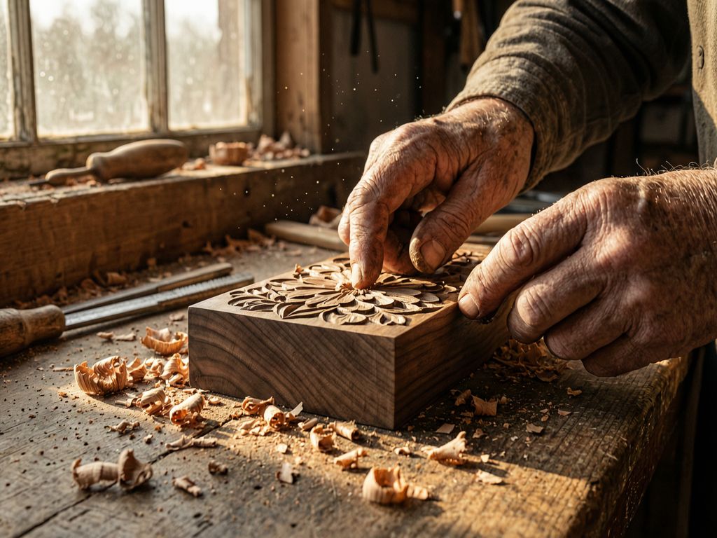 A meticulous close-up of an elderly artisan's hands carving intricate floral ...