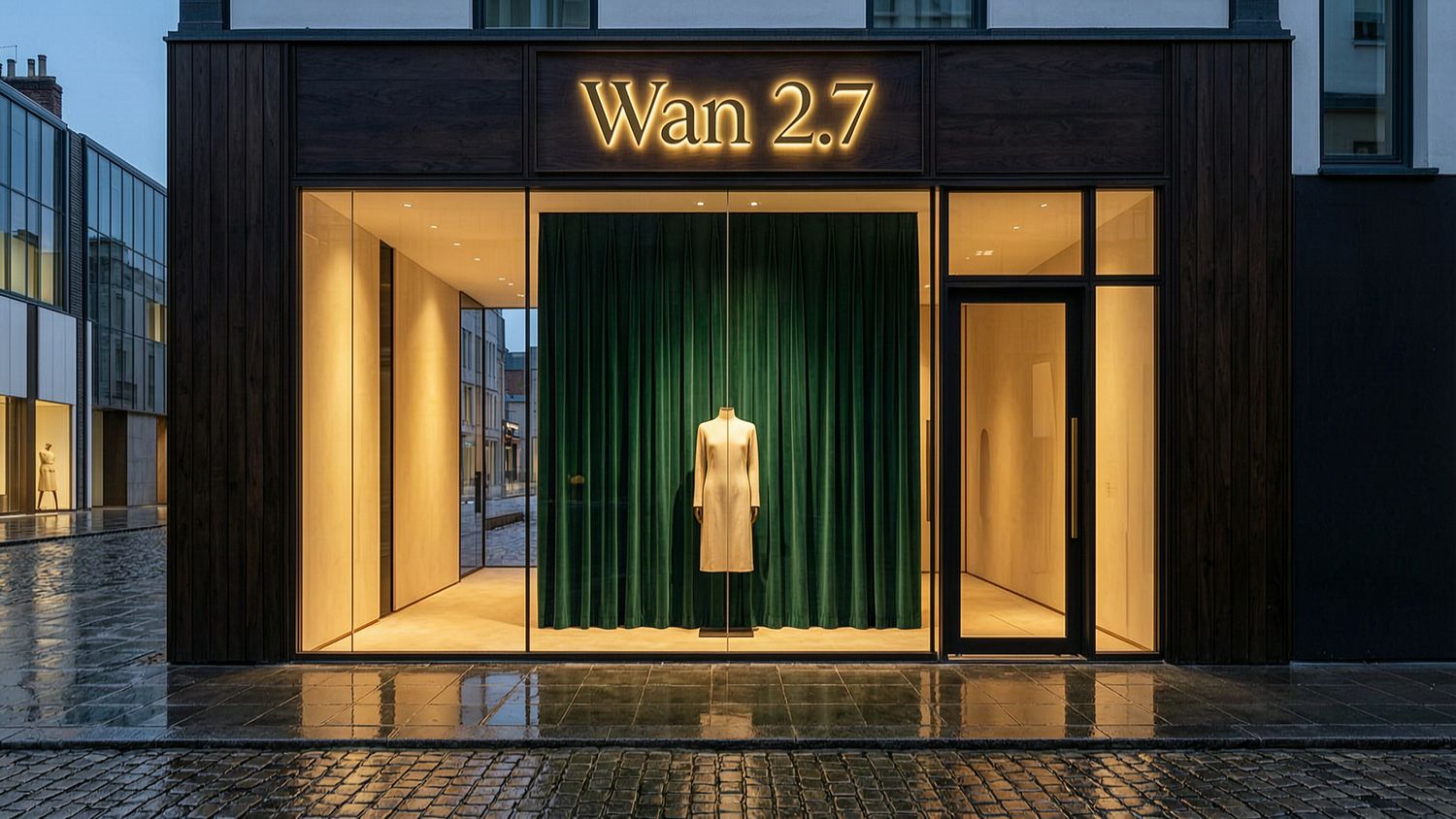 A wide cinematic shot of a high-end, minimalist boutique storefront at dusk. ...