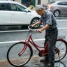 Text-to-Image“A candid street photo of an elderly Japanese man repairing a red bicycle in light rain, reflections on wet pavement, shallow depth of field, 50mm lens, natural skin texture, imperfect framing, motion blur from passing cars, cinematic but realistic, no stylization.”