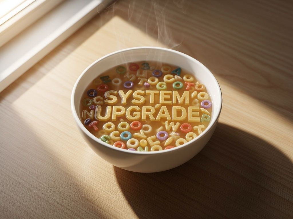 A cozy street-side bakery window reflecting the morning sun, with the word "A...