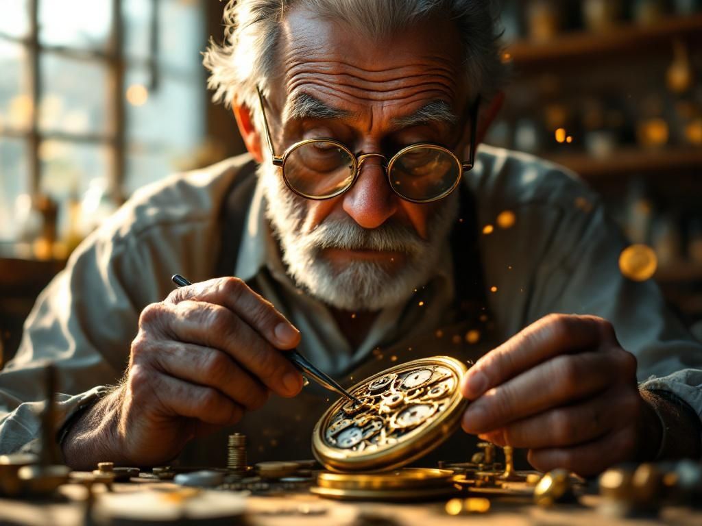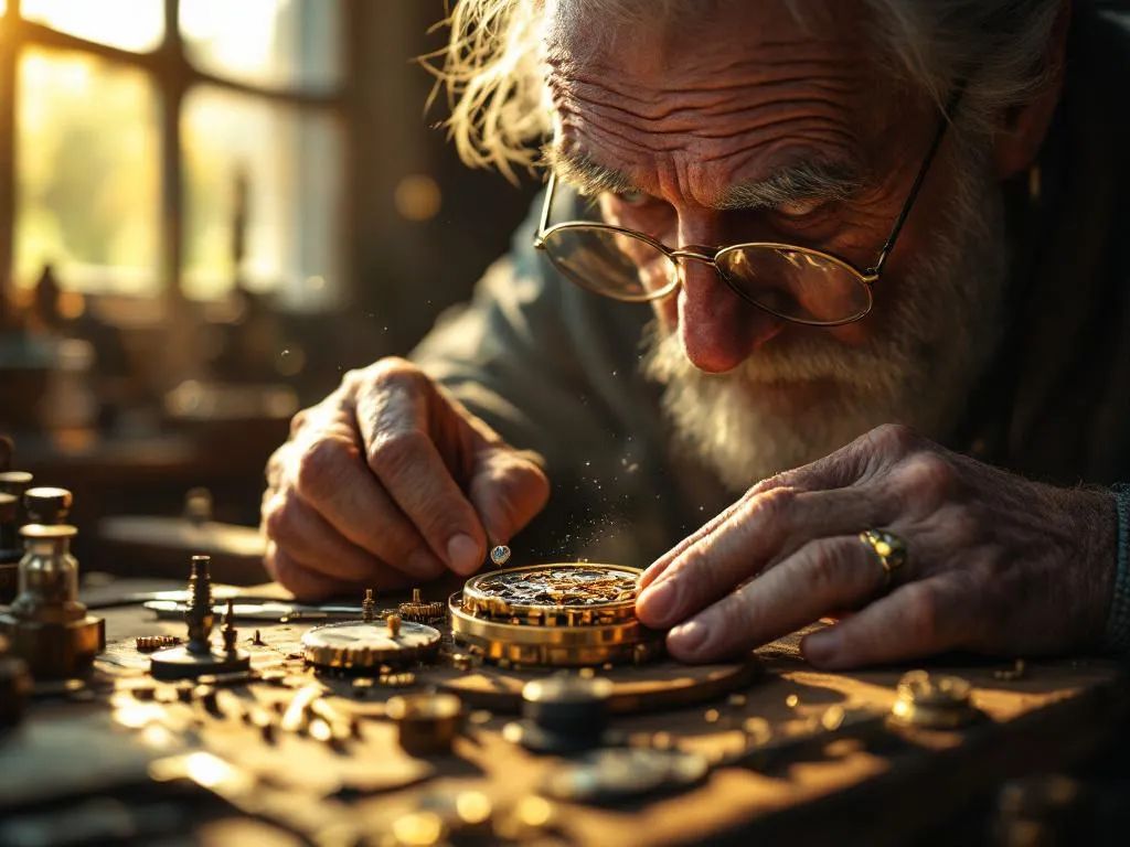 A hyper-realistic close-up portrait of an elderly watchmaker in a sun-drenche...
