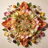 “Perfectly symmetrical mandala made entirely of real flowers, petals, leaves, fruits, and seeds in vibrant natural colors, intricate layered patterns with radial symmetry, top-down view on a soft neutral background, hyper-detailed organic textures and subtle shadows, photorealistic, 8K masterpiece.”