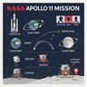 “Create a clean, modern vector infographic poster about the Apollo 11 mission. NASA-inspired palette (navy, white, muted red, light gray). Flat-vector style, crisp lines, consistent iconography, subtle gradients only. Steps (stop at landing): 1. Launch (Saturn Vicon) 2. Earth Orbit (Earth + orbit ring icon) 3. Translunar (trajectory arc icon) 4. Lunar Orbit (Moon + orbit ring icon) 5. Descent (lunar module descending icon) 6. Landing (lunar module on the surface icon) Small supporting elements (minimal text): • Crew strip: three silhouette icons with only last names: Armstrong, Aldrin, Collins. • Landing site marker: Moon pin labeled "Tranquility" only. Layout constraints: generous margins, large readable labels, clean background with subtle stars. Vector-only, print-poster look, high resolution.”