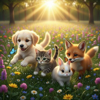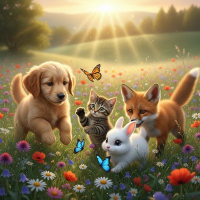 “Hyper-photorealistic scene of fluffy baby animals—a golden retriever puppy, tabby kitten, baby bunny, and red fox kit—with big expressive eyes and ultra-detailed soft fur, playfully chasing butterflies and tumbling together in a lush wildflower meadow, warm golden sunrise light with god rays and dew sparkles, joyful wholesome vibe, 8K masterpiece.”