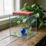 “A glass cube on a wooden table. Inside the cube is a small blue sphere. On top of the cube sits a red book. A green plant is behind the cube, partially visible through the glass. Soft window light from the left.”