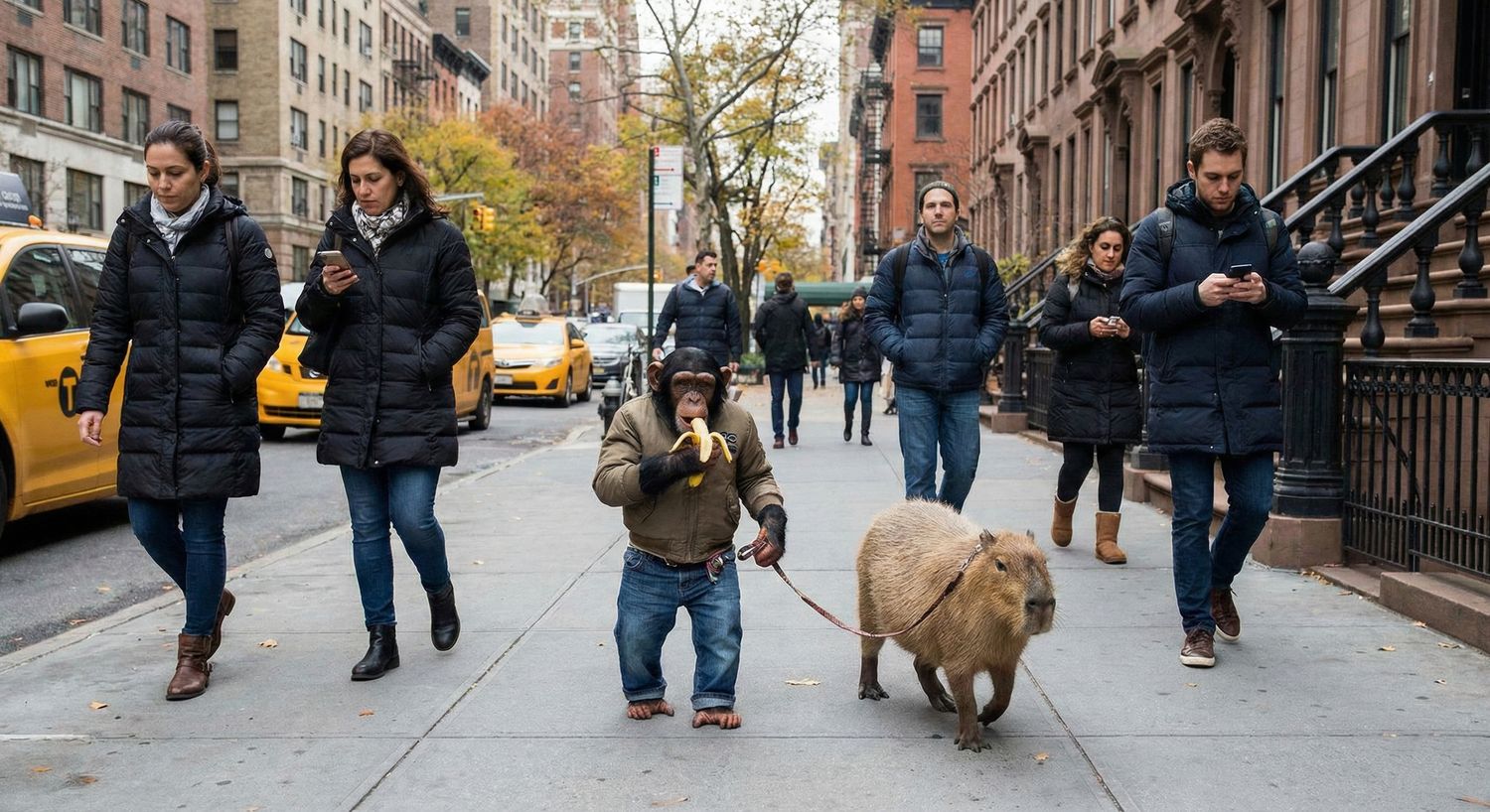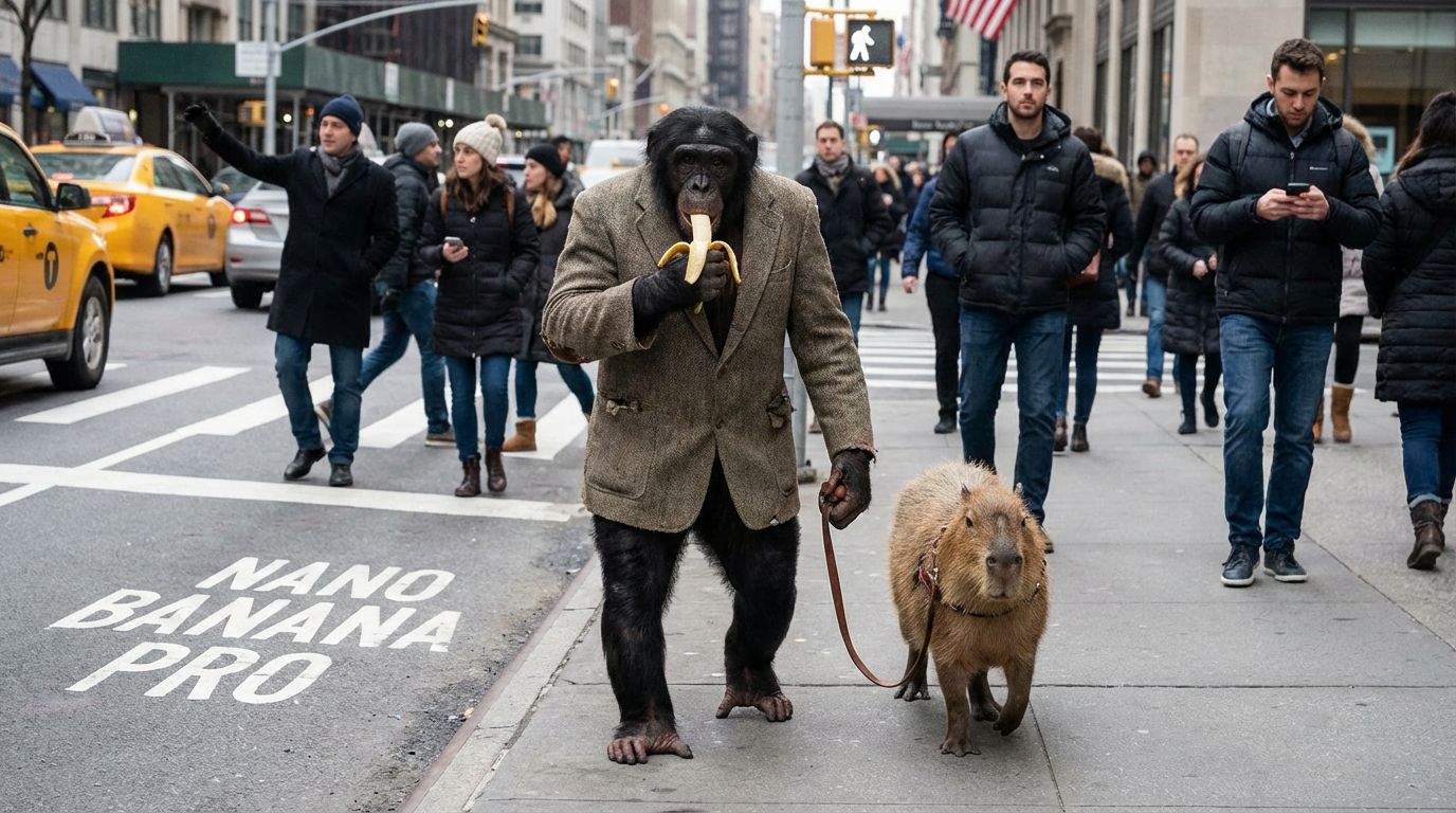 Create an image of an ape, eating a banana, walking trough the streets of new...