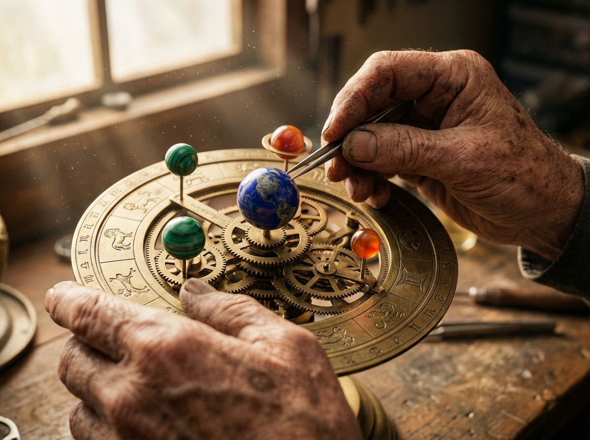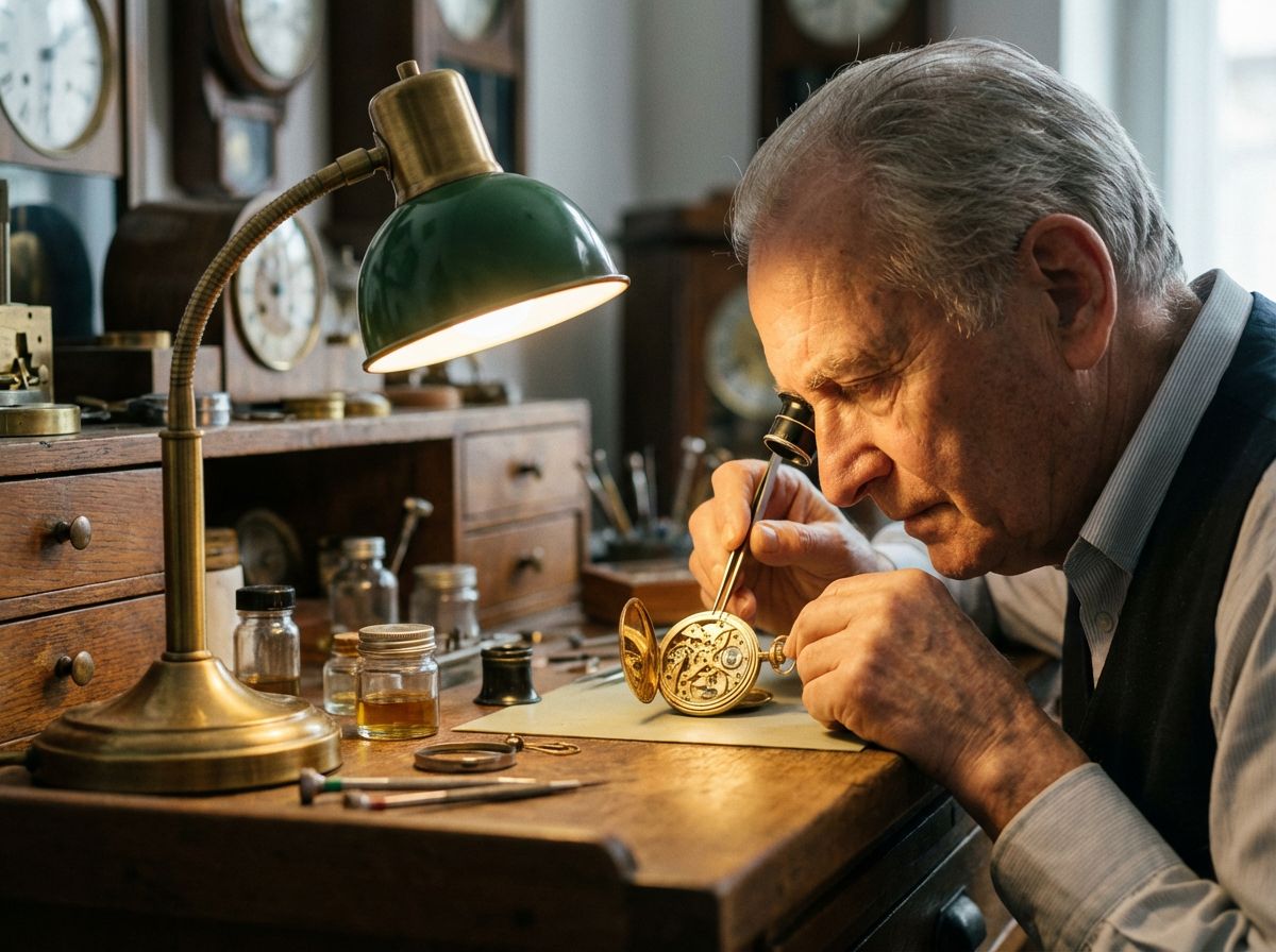 A medium-shot portrait of a master watchmaker at an antique wooden workbench,...