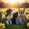 Text-to-Image“Hyper-photorealistic scene of fluffy baby animals—a golden retriever puppy, tabby kitten, baby bunny, and red fox kit—with big expressive eyes and ultra-detailed soft fur, playfully chasing butterflies and tumbling together in a lush wildflower meadow, warm golden sunrise light with god rays and dew sparkles, joyful wholesome vibe, 8K masterpiece.”