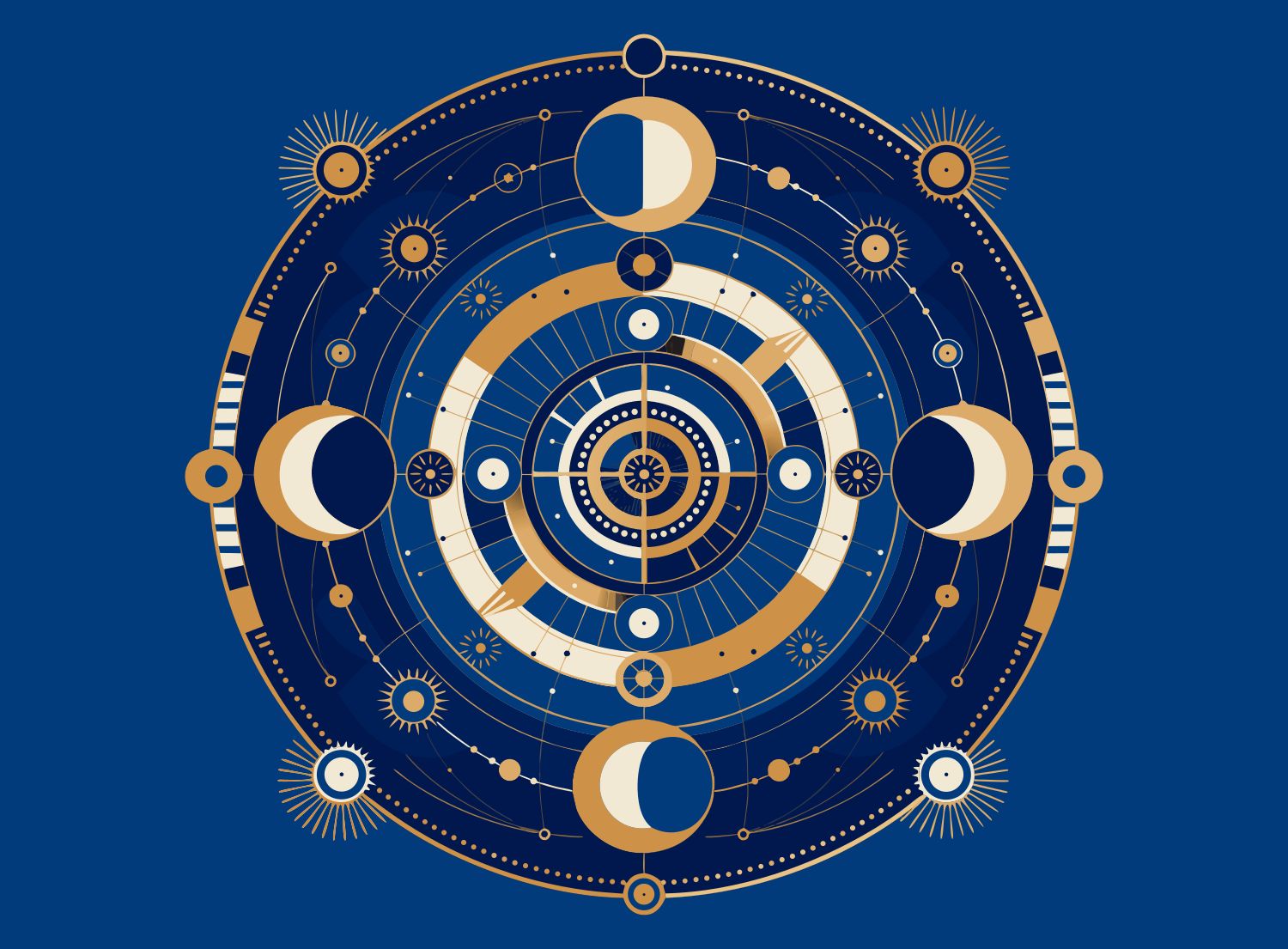 A complex, symmetrical vector illustration of an intricate astronomical clock...