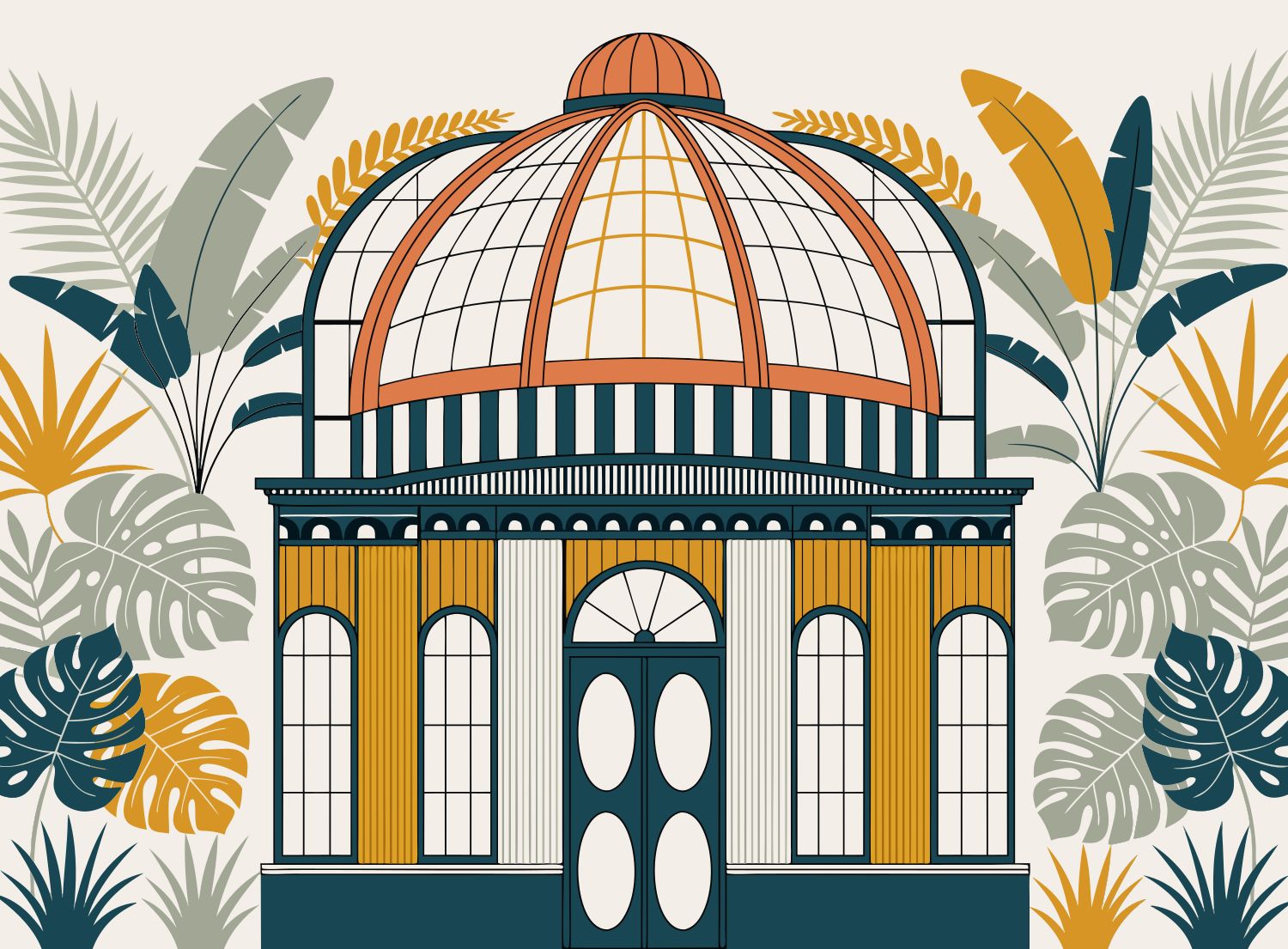 A vibrant, flat-style vector illustration of a mid-century modern botanical g...
