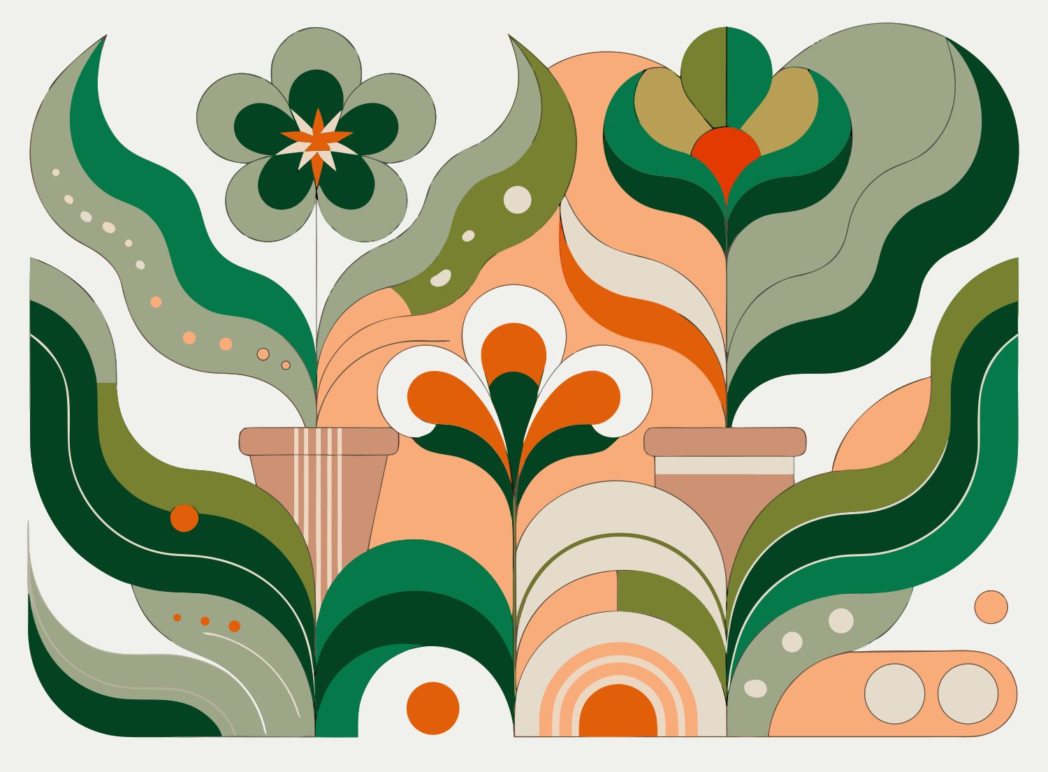Minimalist flat vector illustration of an organic, flowing botanical garden. ...
