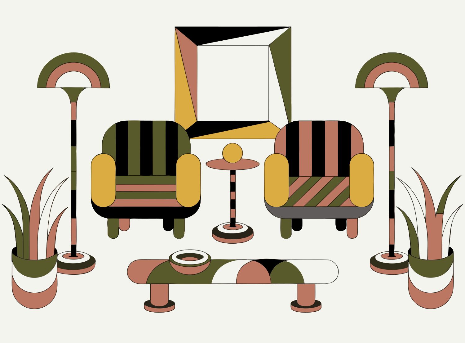 Minimalist vector flat design of a mid-century modern living room, clean geom...