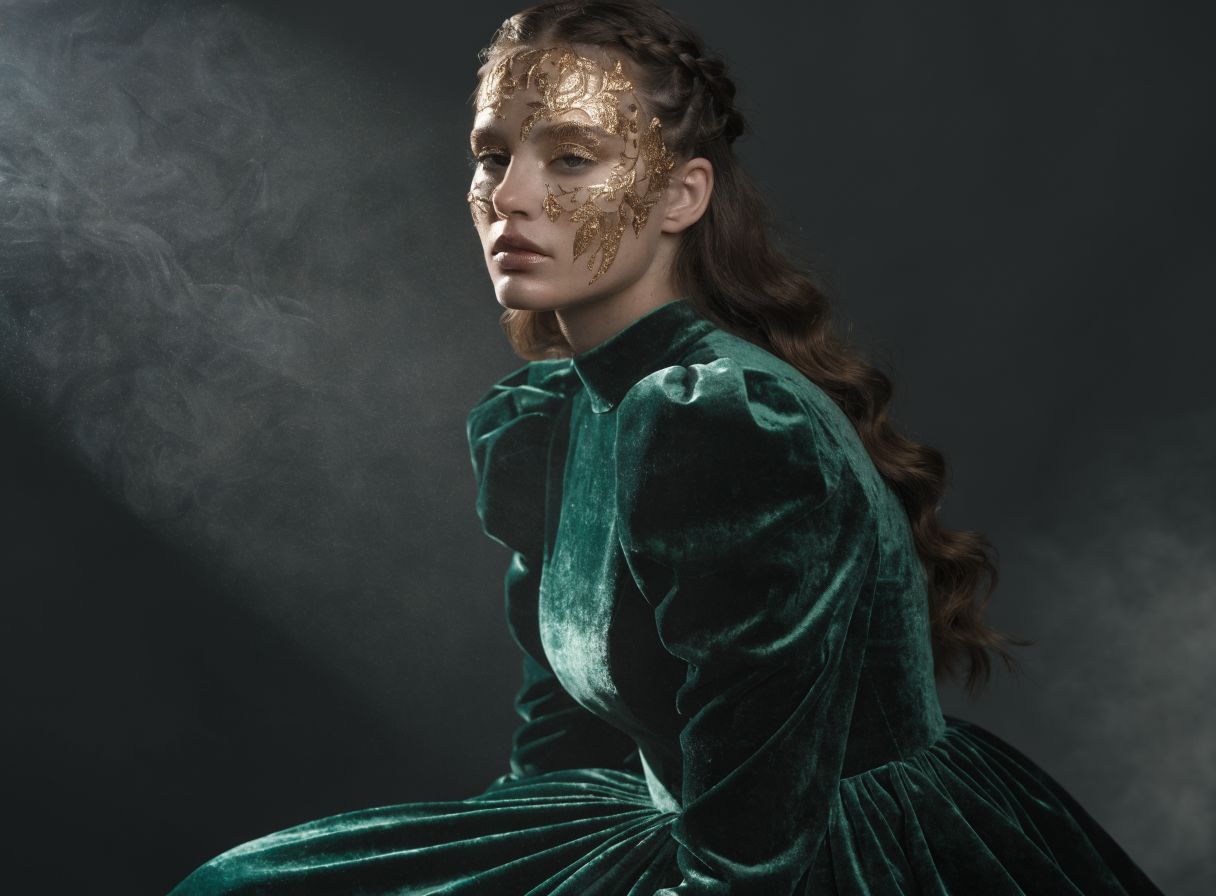 A hyper-realistic studio portrait of a young woman with intricate botanical p...
