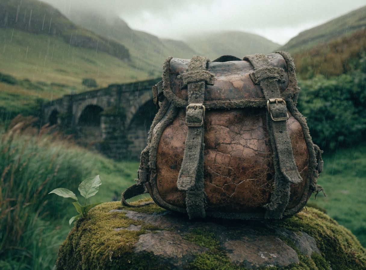 A hyper-realistic close-up of a weathered, vintage leather traveler's backpac...